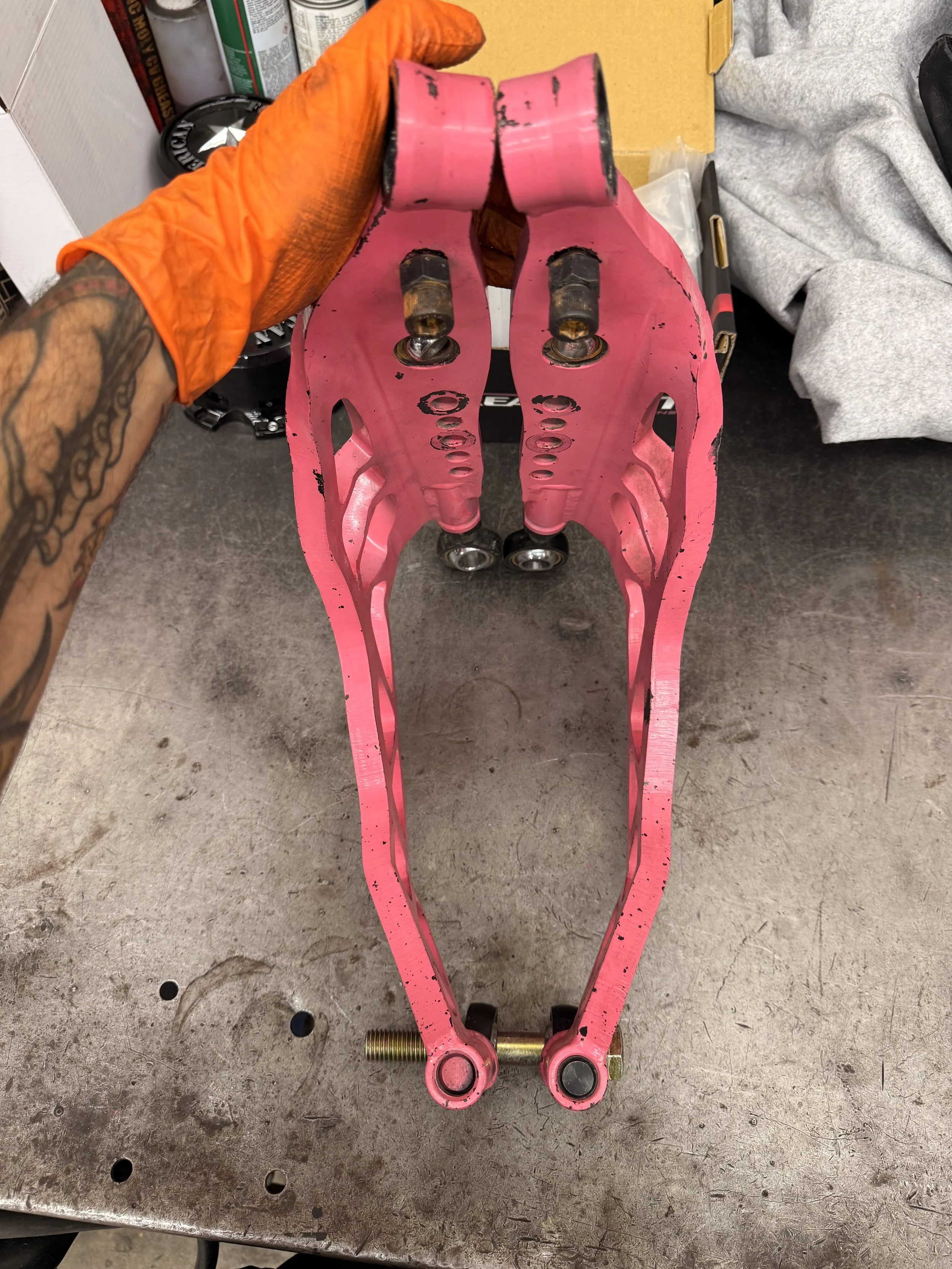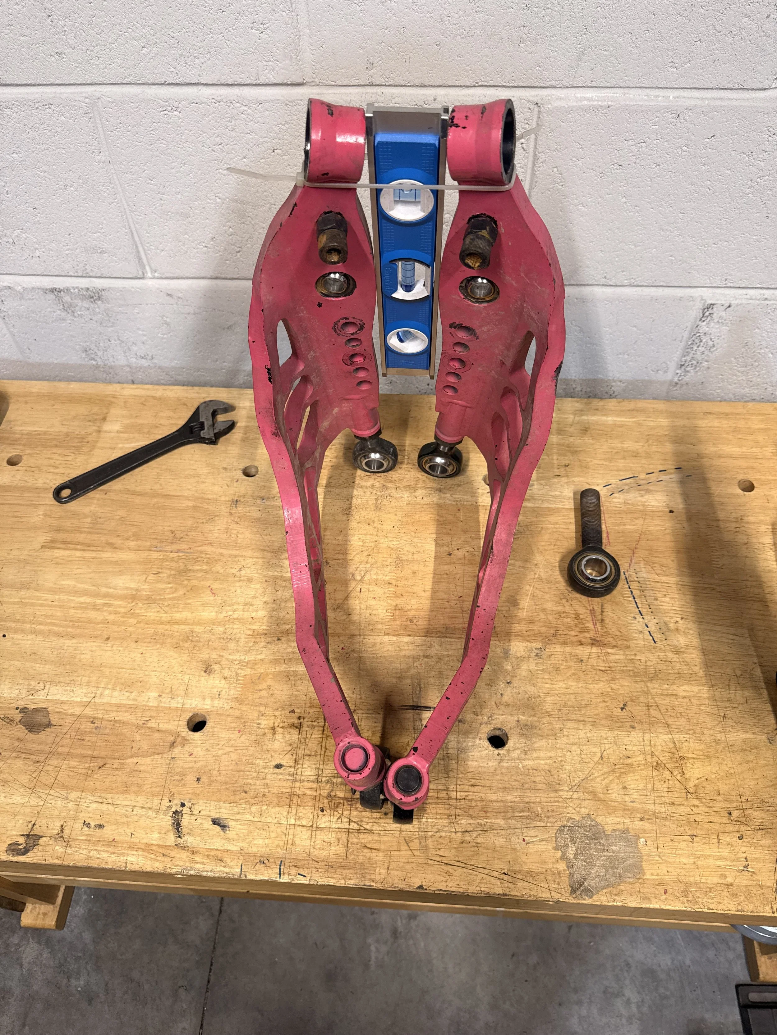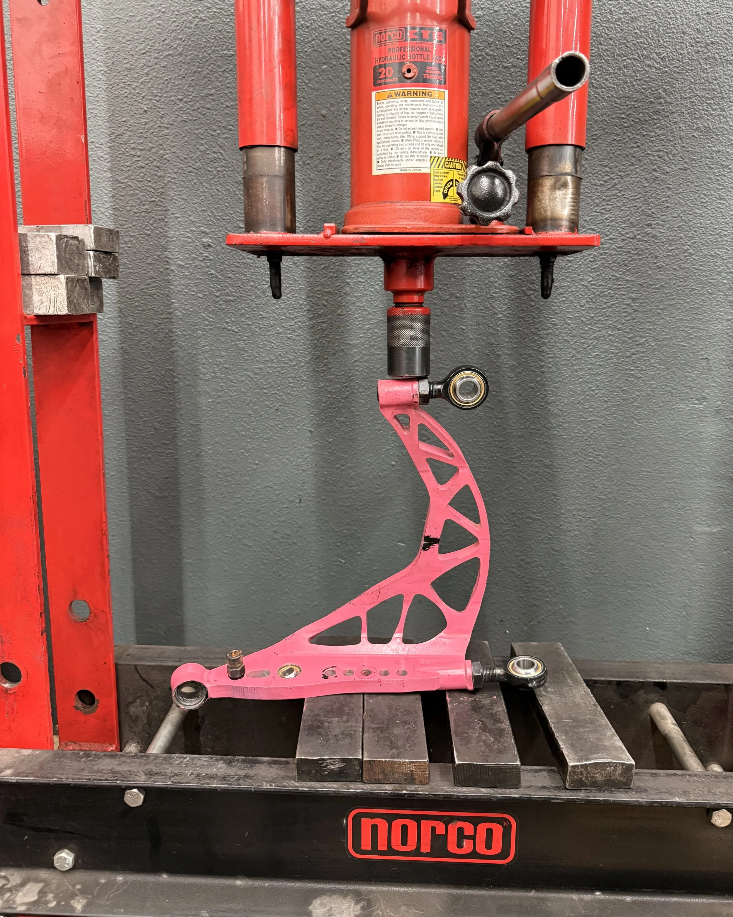 I’d like to give a shoutout to GKTech for supplying replacement consumables for my V1 SuperLock LCAs. Unfortunately, the damage from DC4 was worse than I thought. I was hoping it was just bent heims, but after pulling the LCAs, I realized the passenger arm was tweaked like 1/2”. With some “precise” hydraulic pressing, was able to get them bent back to a tolerable spec.